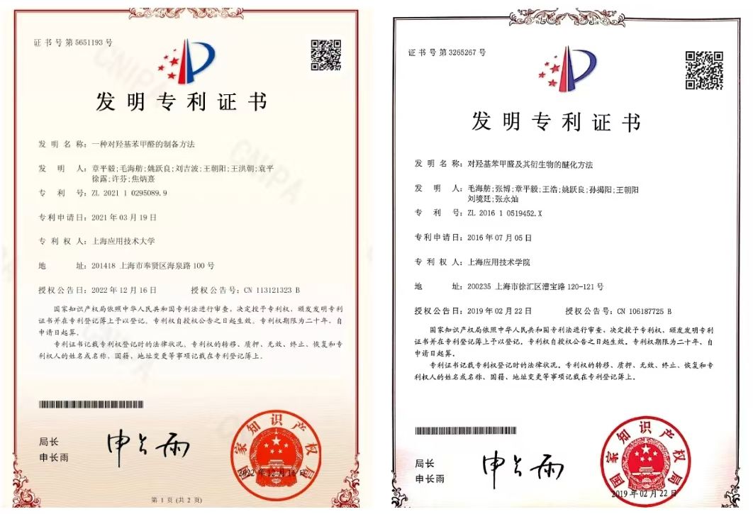 本次转化受让方江西东玶科技有限公司位于江西省吉安市吉水县,是一家香料生产型企业。吉水县拥有松林面积近百万亩,林业资源丰富,林化香料产业是江西省特色产业,也是吉水县列入重点扶持的地方优势企业。2024年8月,毛海舫教授团队应吉水县政府邀请进行了实地考察,指出影响吉水县林化香料产业发展的关键瓶颈问题。校企双方签署战略合作协议,达成了“一种对羟基苯甲醛的制备方法” 和“对羟基苯甲醛及其衍生物的醚化方法”两项专利成果转让协议。