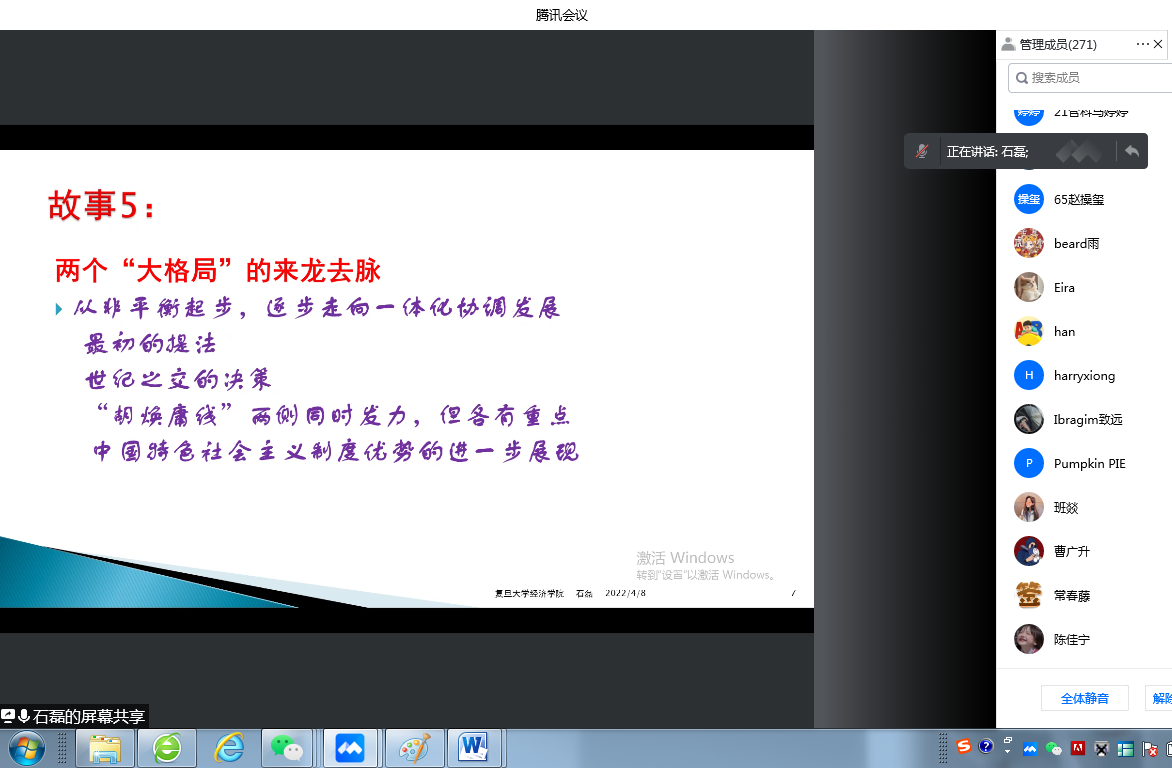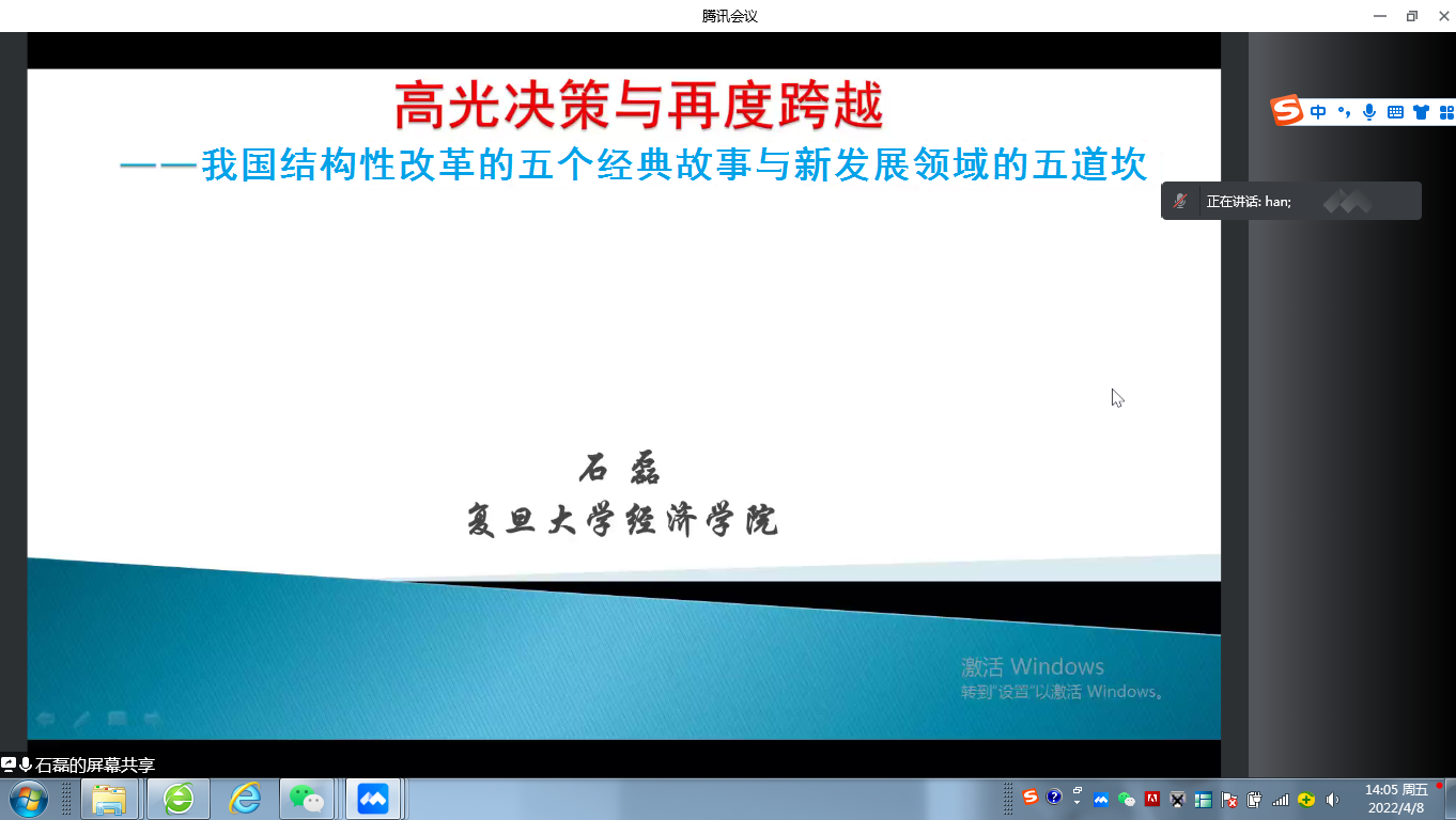 4月8日下午,复旦大学经济学院、沪港发展研究所所长石磊教授应邀参加我校“迎校庆,大师风云学术报告系列”学术活动,为我校师生带来题为“高光决策与再度跨越——中国结构性改革的五个经典故事与新发展领域的五道坎”的精彩报告。本次活动由科研院院长韩生主持,经管学院、马克思主义学院、人文学院和科学技术研究院等270余名师生,通过腾讯会议在线聆听报告。